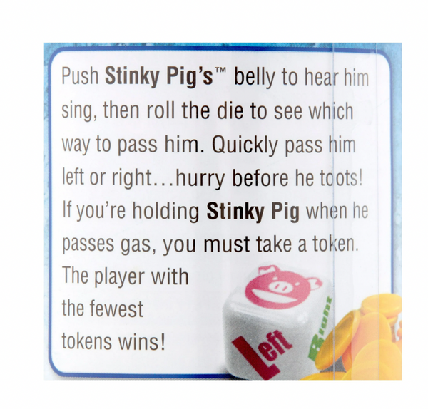 Poke Stinky Pig’s belly to hear him sing, and then roll the die to see which way to pass him. Do it fast…pass him left, pass him right, roll again…but hurry before he…toots! If you’re holding Stinky Pig when he passes gas, you must take a token. But then keep playing…quickly…and the player with the fewest tokens in the end wins! For 2 or more players. Includes two "AA" replaceable batteries.