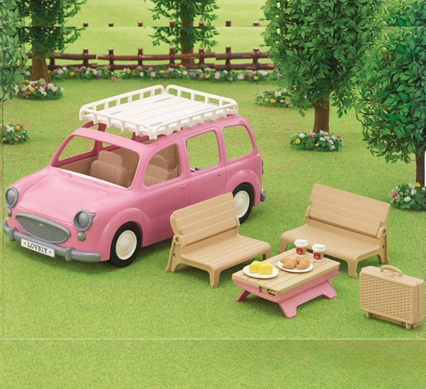 Pack the car and take the family on a picnic in Calico Village! The Family Picnic Van is perfectly pink in color and seats up to 10 Calico Critters figures including parent, child and baby figures - even twins and triplets! This family vehicle is equipped with real rotating tires and steering wheel to set off for a wonderful day exploring nature! Set includes removable bench seating and trunk door which convert into a picnic table set! Picnic basket with plates, croissants and cheese and two coffee cups complete the picnic, and roof rack converts to a hopscotch game for the little ones to play and have fun!