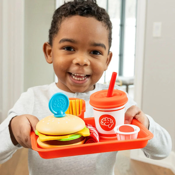 Celebrate an icon of American cuisine with the Pretendables Burger & Fries set. Pretendables Burger & Fries Pretend play set featuring burger ingredients, a drink cup, and fries Encourages fine motor skills, imaginative play, role play Toohpick screws into burger to hold everything together Silicone lid of drink cup features bubbles to pop again and again.