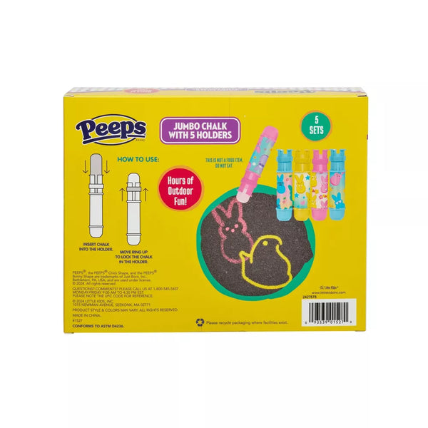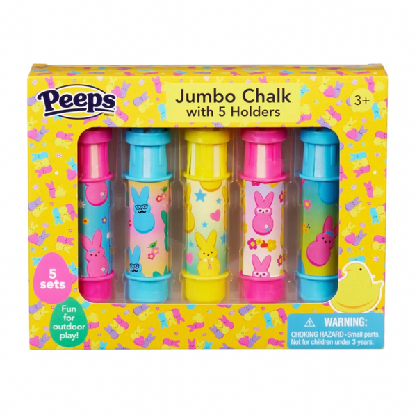 The Peeps Jumbo Chalk set is the perfect companion to your child's sidewalk fun! The Peeps Chalk set includes 5 Peeps themed chalk holders as well as five pieces of chalk. The holders are perfectly sized for little kid's hands and help them draw with chalk. Ages 3 years+